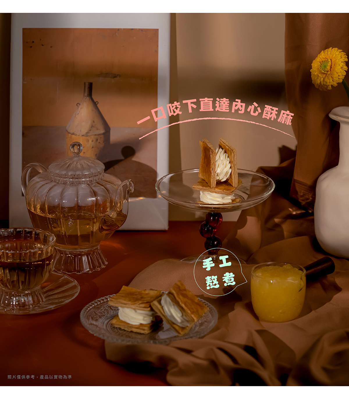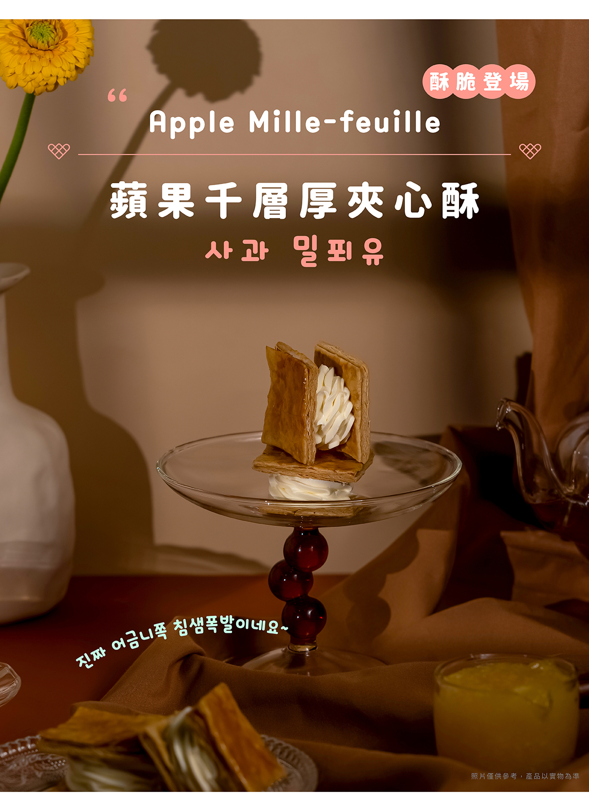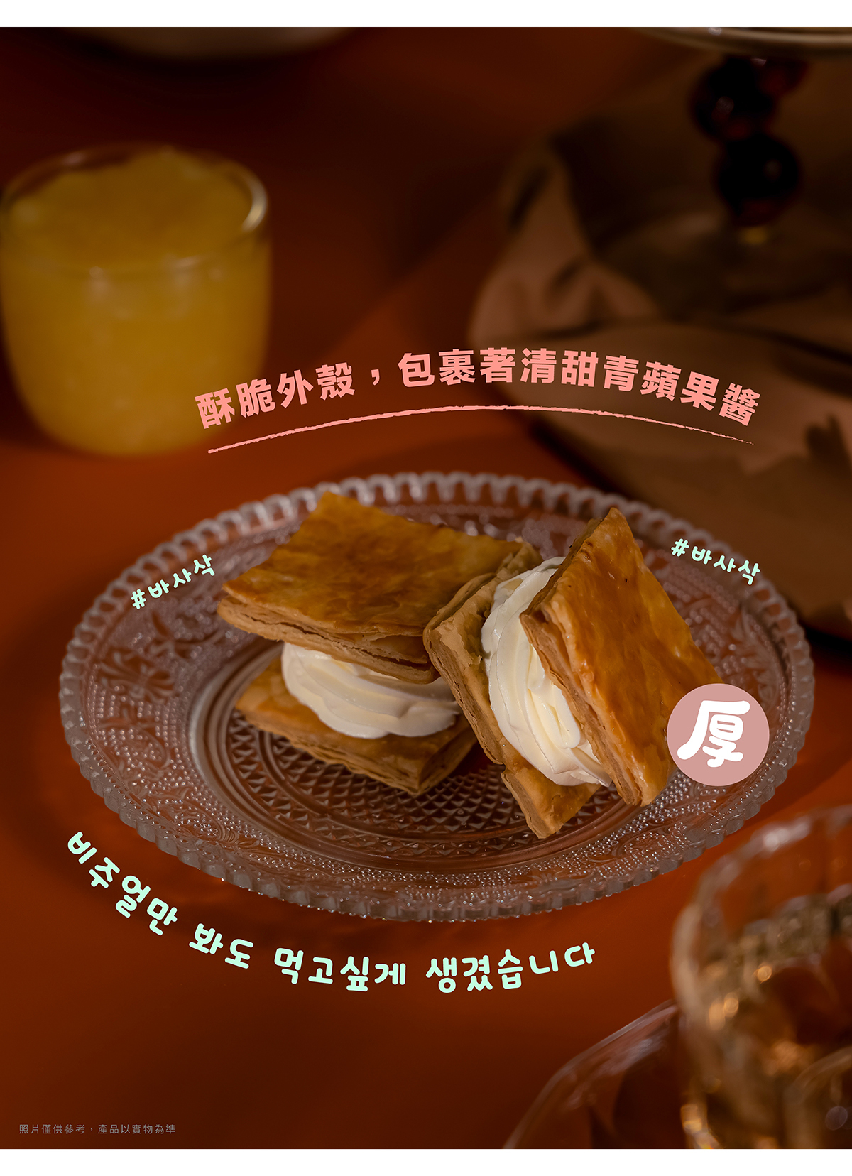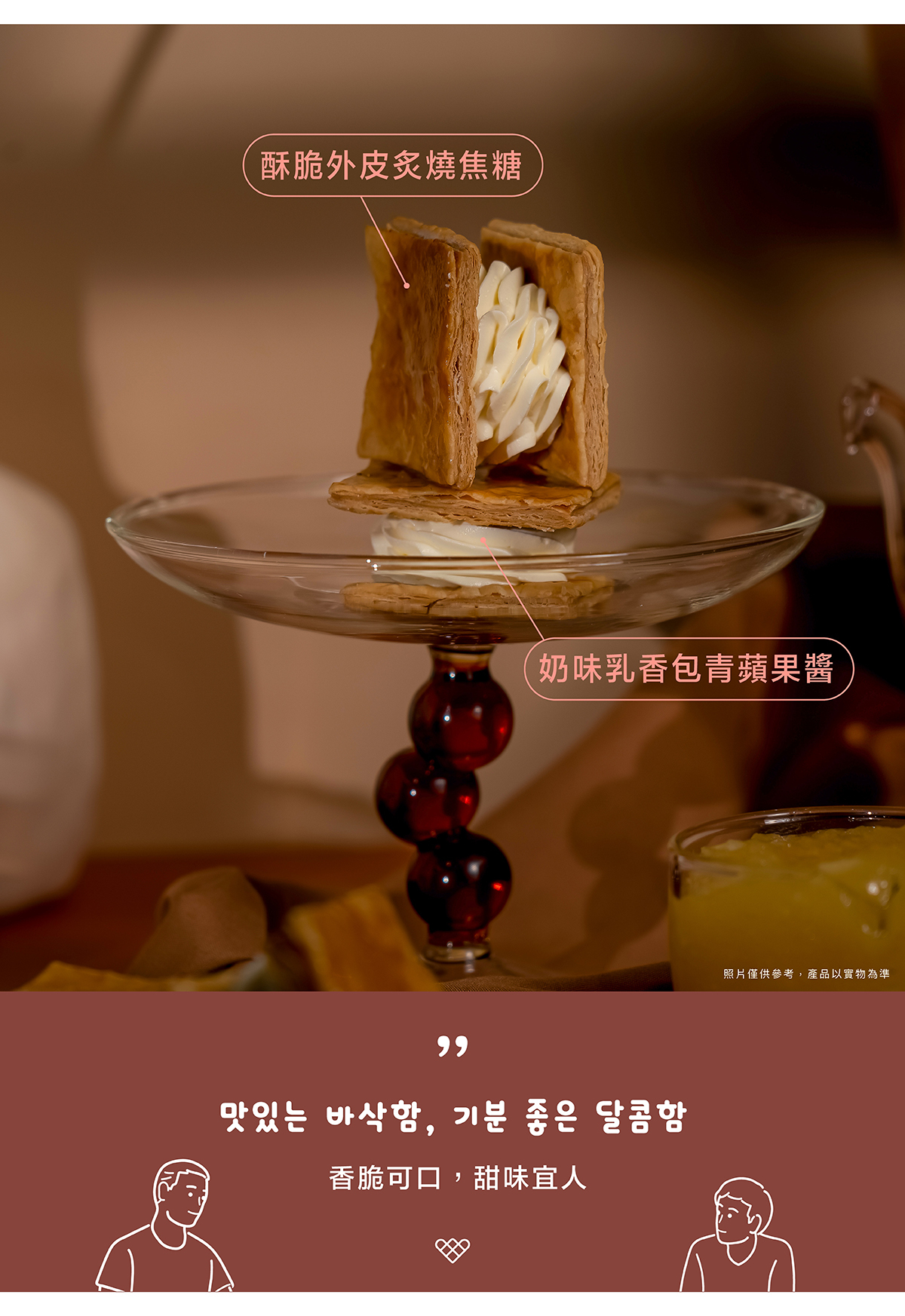 사~악!微酥的層層餅香,經過細火焦糖炙燒,每一層都酥香分明,微脆中帶著焦糖的微甜。內餡以滑順奶香包裹手工熬煮的青蘋果醬,果香清爽、酸甜平衡,讓口感層層交疊。輕咬一口,酥、香、柔在舌尖綻放,彷彿一整顆秋日青蘋果在心中化開。用手工熬煮的甜香,封存秋天的味道。 🍂