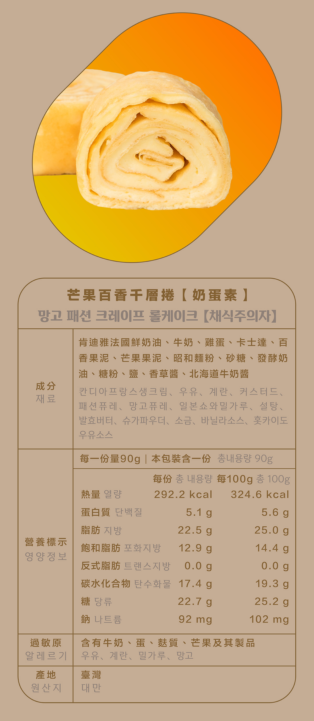 夏天的初戀滋味,百香果的酸、芒果熟成的甜🥭 結合鮮奶油的奶香,散發出果香與蛋皮香~ 一捲在手美味無窮。一口咬下幸福滿溢,是下午茶甜點、聚會送禮的最佳選擇💯
