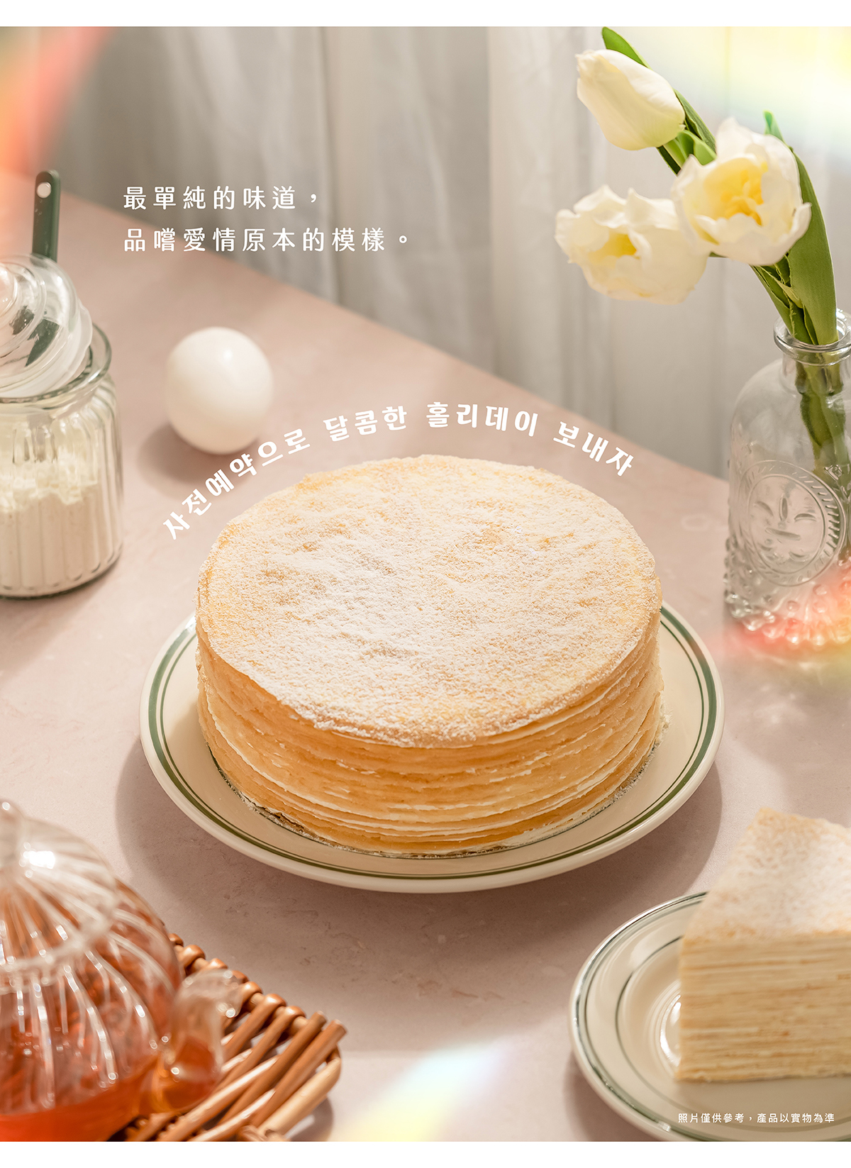 最單純的味道,品嚐愛情原本的模樣|經典原始風味,純粹的乳香與蛋香~🥛 蛋皮的香氣,撒上雪花般的糖粉,輕柔的甜蜜氛圍,趕快動手預訂千層蛋糕吧!🎂